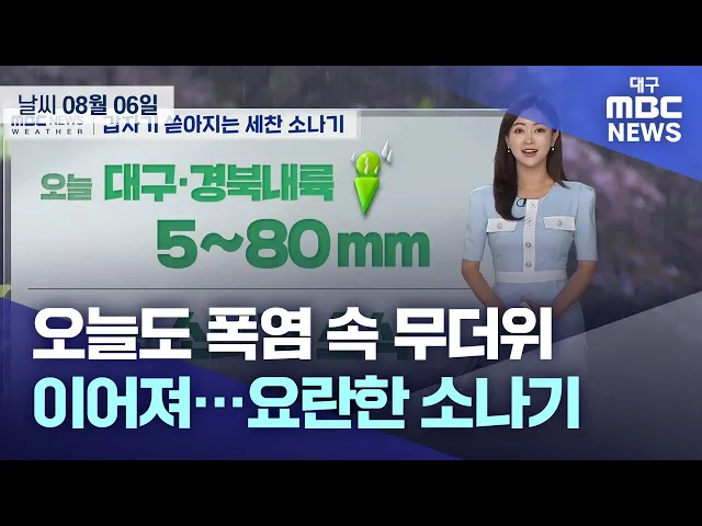 8월 6일 화요일 대구와 경북 지역은 구름 많은 가운데 오전부터 밤사이 5~80mm의 소나기가 오겠습니다.소나기는 돌풍과 천둥, 번개를 동반하겠고 시간당 30~50mm의 매우 강한 소나기가 쏟아지는 곳이 있겠습니다.밤사이 최저기온은 대구 23.8도, 안동 22.2도를 보였고, 포항은 25.7도로 13일째 열대야가 이어지고 있습니다....