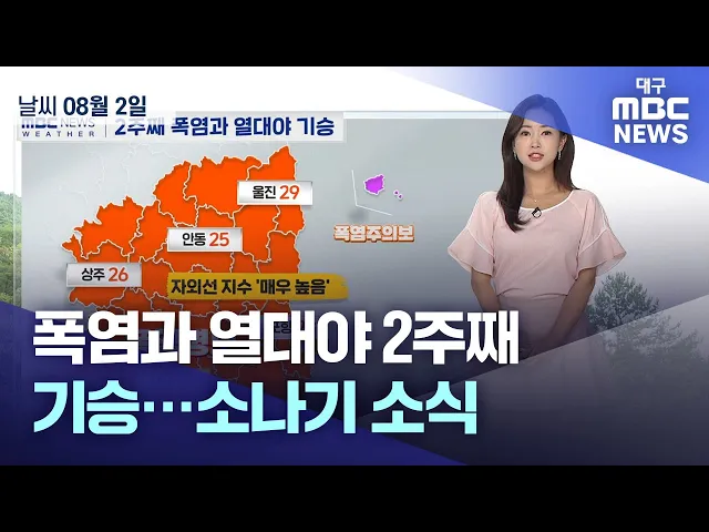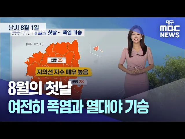 8월 1일 목요일도 찜통더위가 이어지겠습니다.대구와 경북 전역에는 일주일 넘게 폭염경보가 발효 중입니다.낮 최고 기온은 대구 36도 등 32~37도의 분포를 보이겠고, 자외선 지수도 한낮 '매우 높음'까지 오르겠습니다.경북 동해안에는 바람이 강하게 부는 곳이 많겠습니다.금요일은 오후 한때 내륙을 중심으로 5~40mm의 ...