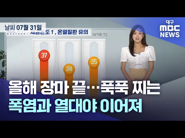 도깨비 장마가 잦았던 올해 장마가 드디어 끝났습니다.기상청은 지난 27일을 기점으로 장마가 종료됐다고 발표했는데요.이제 당분간은 열대야와 푹푹 찌는 폭염이 계속 기승을 부리겠습니다.오늘도 여전히 대구와 경북 전 지역에는 폭염경보가 이어지고 있습니다.아침부터 25도를 넘어서며 열대야가 나타나는 지역도 많은데...