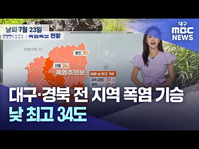 장맛비가 쉬어가니 기다렸다는 듯 폭염이 기승을 부리고 있는데요.어제 경주 감포의 낮 최고 기온은 37.3도, 영덕은 35.9도까지 치솟았습니다.오늘도 대구와 경북 전 지역에는 폭염특보가 이어지고 있습니다.현재 대구를 포함해 지도에 짙게 표시된 지역들은 폭염주의보에서 폭염경보로 격상된 곳이고요.아침부터 대부분 지...