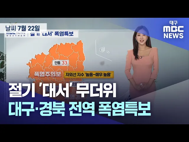 절기상 대서인 7월 22일 월요일 대구와 경북 지역은 무더운 날씨가 이어졌습니다.군위를 제외한 대구와 경북 9개 시군에 폭염경보가, 그 밖의 지역에는 폭염주의보가 발효 중입니다.낮 최고 기온은 경주 감포 37.3도, 영덕 영덕읍 35.9도, 대구 신암 35.5도 등 28.3도에서 37.3도까지 올랐습니다.화요일도 대체로 흐리겠고 ...