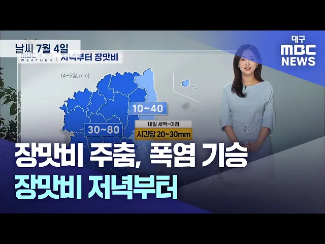 대구와 경북 10개 시·군에 이틀째 폭염주의보가 내려진 가운데 7월 4일 목요일은 저녁부터 차차 흐리다가 다시 장맛비가 오기 시작하겠습니다.예상 강수량은 금요일까지 대구와 경북 내륙에 30~80mm, 동해안에 10~40mm입니다.아침 최저 기온은 대구 22.8도, 포항 23.9도, 안동 21.8도 등에 머물렀고, 경북 영덕과 울진 평해...