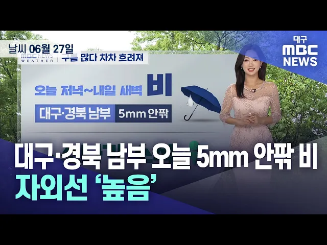 6월 26일 수요일 대구와 경북 지역은 대체로 맑은 가운데 늦은 오후부터 저녁 사이 경북 북동 산지에 5~20mm의 소나기가 오겠습니다.낮 최고 기온은 대구 29도 등 26~30도의 분포로 전날과 비슷하겠습니다.자외선 지수는 한낮 '매우 높음' 단계까지 오르겠습니다.목요일은 정체전선의 영향으로 흐리고 대구와 경북 남부 지...