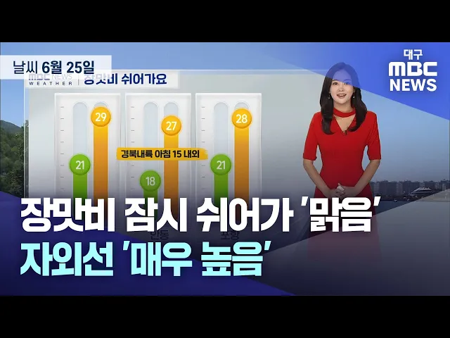 대구와 경북 지역은 대체로 맑은 가운데 더위는 6월 24일보다 덜하겠습니다.6월 25일 화요일 낮 최고 기온은 대구 29도 등 25~30도의 분포를 보이겠습니다.한낮 자외선 지수는 경북이 '매우 높음', 대구는 '위험' 단계까지 오르겠습니다.경북 동해안과 일부 내륙에는 바람이 강하게 부는 곳이 많겠습니다.수요일은 차차 구...