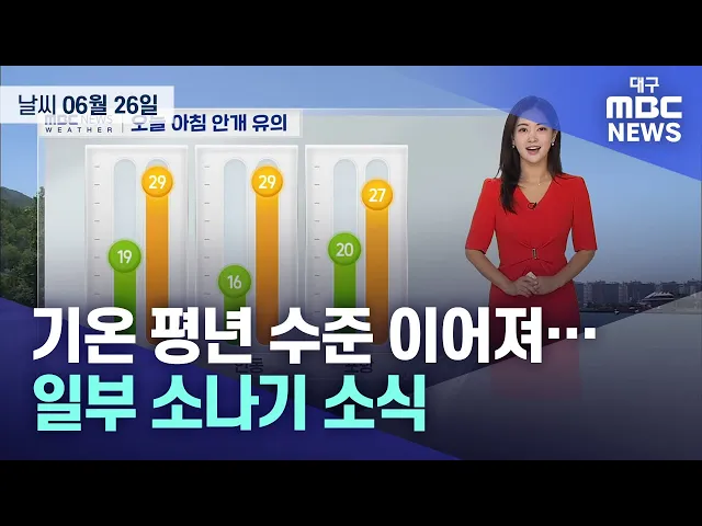 6월 26일 수요일 대구와 경북 지역은 가끔 구름 많은 가운데 30도 안팎의 더위가 이어졌습니다.저녁까지 경북 북동 산지에는 돌풍과 천둥, 번개를 동반한 5~20mm의 소나기가 오는 곳이 있겠습니다.낮 최고 기온은 성주 31.2도, 김천 30.9도 등으로 전날보다 조금 높았습니다.목요일은 대체로 흐린 가운데 늦은 오후부터 금...