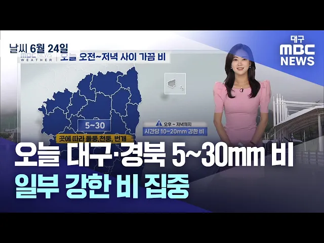 지난 주말부터 대구와 경북에도 장마가 시작됐는데요.오늘도 오전부터 저녁사이 가끔 비가 내리겠습니다.오늘 대구와 경북에 예상되는 비의 양은 5~30mm고요.비구름이 좁은 지역에서 강하게 발달하면서 오후부터 저녁까지 시간당 10~20m의 강한 비가 집중되는 곳도 있겠습니다.더불어 곳에 따라 돌풍과 함께 천둥, 번개가 ...