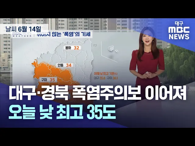 대구와 경북 지역은 6월 14일 금요일도 불볕더위가 이어지겠습니다.대구와 구미, 영천 등 경북 11개 시군에는 폭염주의보가 계속 발효 중입니다.금요일 낮 최고 기온은 대구 34도, 의성·경주 35도 등 27~35도의 분포를 보이겠고 한낮 자외선 지수는 '매우 높음' 단계까지 오르겠습니다.경북 서부 내륙은 늦은 오후부터 저녁...
