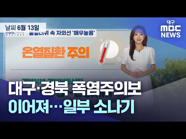 ◀앵커▶6월 11일 화요일 대구와 경북은 낮 기온이 35도 이상 넘나들며 어제보다 더 뜨거웠습니다.‘폭염주의보’도 이틀째 이어지고 있습니다.때 이른 더위에 어제까지 경북에서만 온열질환자가 13명 발생해 2023년보다 크게 늘었습니다. 유하경 기상캐스터가 전해드립니다.◀ 기상캐스터 ▶아직 6월인데 폭염이 기승입니다.제가...
