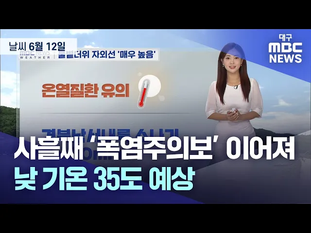 6월 12일 수요일 대구와 경북 지역은 불볕더위가 이어졌습니다.낮 최고 기온은 상주 은척 35.7도, 경주 황성 35.3도, 대구 33.8도 등을 보였습니다.대구와 구미, 영천, 경산, 청도 등 경북 11개 시군에는 폭염주의보가 발효 중입니다.늦은 오후부터 저녁 사이 경북 남서 내륙에는 천둥·번개를 동반한 5mm 안팎의 소나기가 ...