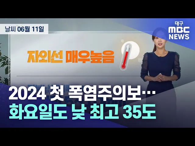6월 10일 월요일 대구·경북 지역에는 2024년 첫 폭염특보가 내리며 무더웠습니다.현재 대구와 경북 경산, 청도, 영천, 경주에 폭염주의보가 발효 중입니다.월요일 낮 최고 기온은 대구 32.8도, 의성 32.6도, 경주 34.1도 등 대부분 지역에서 2024년 들어 가장 높은 기온을 기록했습니다.늦은 오후부터 밤사이에는 내륙을 중...