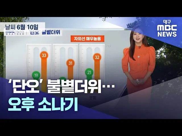단오 날인 오늘도 불볕더위가 예상됩니다. 먼저 오늘 오전까지는 대구와 경북내륙을 중심으로 짙은 안개가 끼어있는 곳이 있는데요. 아침 기온은 대구 19도, 안동 17도, 포항 21도로 후텁지근합니다. 낮에는 대구 33도, 안동 31도, 포항 32도까지 치솟겠고요. 자외선 지수도 '매우 높음' 단계, 최고 체감온도도 31도 이상으...