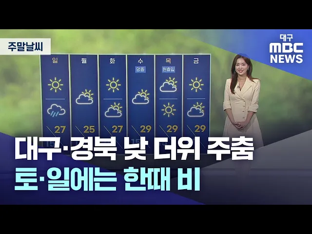 5월 31일 금요일 대구·경북 지역은 초여름 날씨를 보였습니다.낮 최고 기온은 대구 29.5도, 영천 29.2도, 의성 28.7도 등으로 더웠습니다.주말은 경북 지역을 중심으로 비가 오면서 기온이 낮아지겠습니다.토요일인 6월 1일은 대체로 흐린 가운데 경북 서부 내륙을 제외한 경북에 5~20mm의 비가 오는 곳이 있겠습니다.토요...
