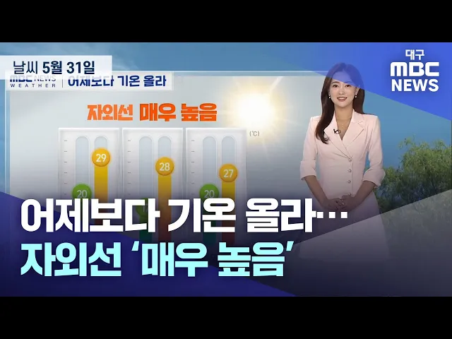 이제 내일이면 달력이 또 한 장 넘어갑니다. 5월의 마지막 날인 오늘, 어제보다 기온이 더 오르겠는데요. 오늘 아침 대구의 기온 20도, 안동 17도, 포항도 20도로 평년보다 높게 시작합니다. 낮 기온은 대구 29도, 안동 28도, 포항 27도까지 오르겠고요. 오늘도 낮에는 강한 볕이 내리쬐며 자외선 지수가 ‘매우 높음’ 단계...