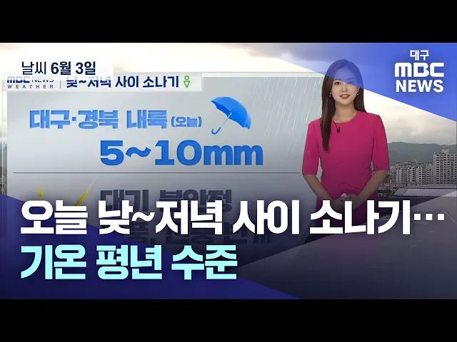 6월 3일 월요일 대구·경북 지역은 구름이 많은 가운데 내륙을 중심으로 낮부터 저녁 사이 소나기가 쏟아지겠습니다.예상 강수량은 5~10mm입니다.비는 짧은 시간 동안 좁은 지역에서 강하게 집중되겠고, 돌풍과 천둥·번개도 동반하겠습니다.월요일 아침 최저 기온은 대구 16.1도, 경주 15.5도, 안동 13.1도 등이었습니다.낮 ...
