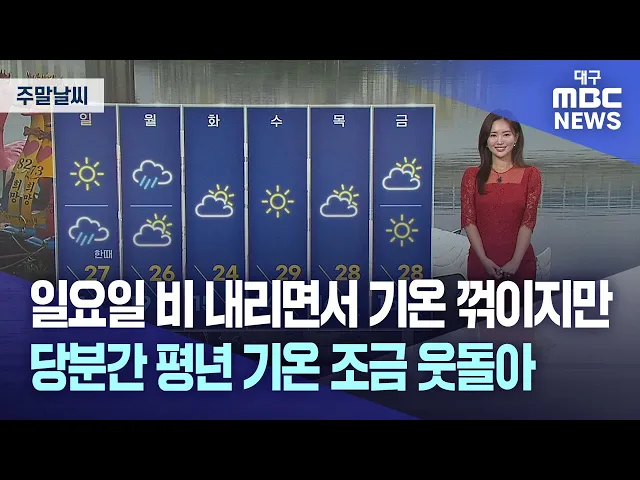 5월 4주 차 대구·경북 '날씨 체크' 시작합니다. 벌써 5월의 마지막 주입니다. 지난주는 때 이른 더위가 기승을 부렸죠. 낮 기온이 무려 30도 이상 치솟았는데요. 이번 주는 평년 기온 이어지며 날도 맑아 나들이 가기 좋겠습니다. 우리 지역 5월 4주 차 평년 최저 기온 15.9도, 평년 최고 기온은 27.5도였습니다.이번 주 대...