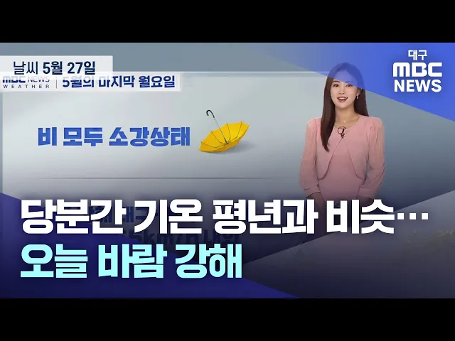 5월의 마지막 월요일이 밝았습니다.새벽까지 강하게 이어지던 비는 모두 그쳤는데요.오늘은 바람이 강하겠습니다.오늘 대구와 경북 대부분 지역에서 순간풍속 55km/h 내외로 바람이 강하게 부는 곳이 있겠고요.경북 동해안은 내일 오전부터 매우 강한 바람이 예상돼 각별히 유의하시기 바랍니다.기온은 당분간 평년과 비슷...