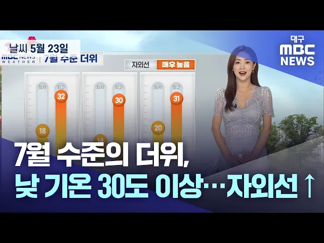 5월 22일 수요일 대구와 경북지역은 다소 더웠습니다.수요일 낮 최고기온이 대구 30.2도, 구미 29.3도, 안동 28.6도 등으로 평년보다 3도가량 높았습니다.목요일도 대체로 맑겠고 아침 최저기온 대구 17도 등 12도에서 19도, 낮 최고기온은 대구 32도 등 26도에서 32도로 조금 더 덥겠습니다.대구지방기상청은 금요일 늦은 ...