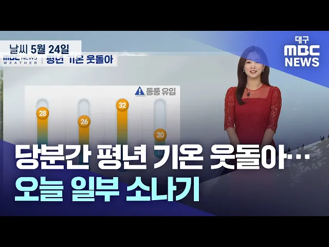 5월 24일 금요일 대구와 경북 지역은 맑다가 차차 구름이 많겠고 내륙을 중심으로 오후부터 소나기가 쏟아지는 곳이 있겠습니다.예상 강수량은 대구와 경북 남서·북부 내륙에 5~20mm입니다.아침 최저 기온은 대구 16.8도, 안동 13도, 포항 17.2도 등이었습니다.낮 최고 기온은 대구 28도 등 18~32도의 분포로, 전날과 비슷...