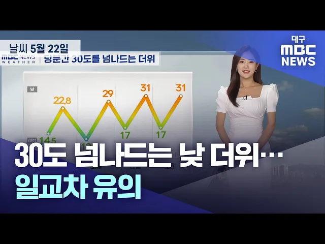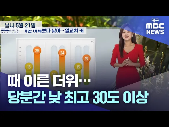 5월 3주 차 대구·경북 '날씨 체크' 시작합니다. 초여름을 알리는 절기 '소만'과 함께 이번 주 맑고 화창한 날씨로 시작했는데요. 이번 주도 계속 덥겠습니다. 지난 주말 대구의 낮 최고 기온은 31.5도까지 치솟아 7월 수준의 더위를 보였는데요. 당분간 대구와 경북내륙을 중심으로 낮 기온이 30도 내외로 오르는 곳이 많아...