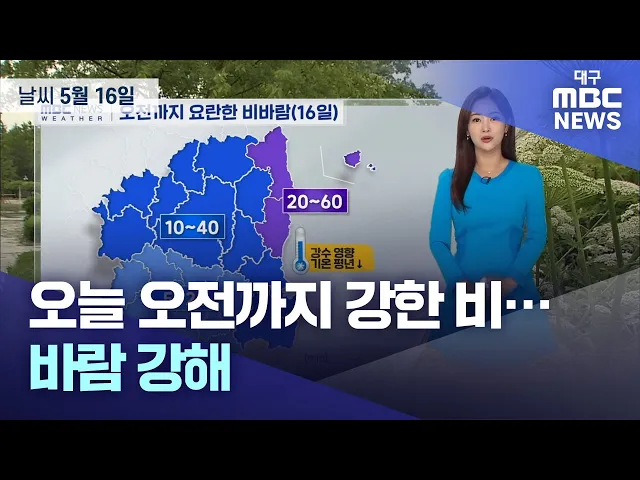 5월 16일 목요일 대구와 경북 지역은 오후부터 차차 맑은 가운데 바람이 강하게 불고 쌀쌀하겠습니다.경북 동해안과 북부, 서부 내륙에는 강풍주의보가, 동해상에는 풍랑특보가 발효 중입니다.낮 최고 기온은 대구 23도 등 17~23도의 분포로 전날보다 5도가량 낮겠습니다.금요일인 17일은 대체로 맑겠고 밤사이 기온이 떨어...