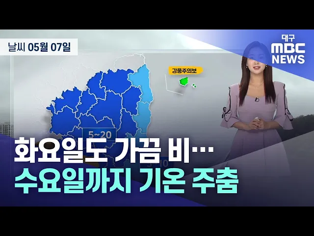 대구와 경북 지역은 5월 7일 화요일도 대체로 흐린 가운데 밤까지 가끔 비가 오는 곳이 있겠습니다.예상 강수량은 동해안에 5~10mm, 그 외 내륙에 5~20mm입니다.아침 최저 기온은 대구 15도, 안동 13.1도, 포항 15.9도 등이었습니다.낮 최고 기온은 대구 18도 등 14~18도에 머물며 전날보다 4~8도가량 낮겠습니다.오전까지 ...