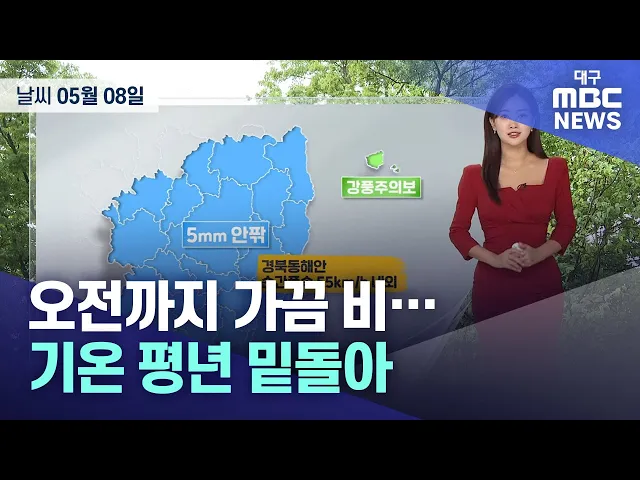 5월 8일 수요일 대구와 경북 지역은 오전까지 곳에 따라 5mm 안팎의 비가 오겠고 늦은 오후부터 차차 맑겠습니다.아침 최저 기온은 대구 10.4도, 안동 7도, 포항 11.3도 등이었습니다.낮 최고 기온은 대구 19도 등 16~21도의 분포를 보이겠습니다.미세먼지와 초미세먼지 농도는 '좋음' 수준이 예보됐습니다. 경북 동해 바다...