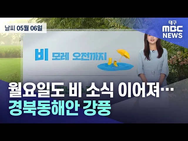 5월의 첫 번째 월요일이자 연휴 마지막 날인 5월 6일도 비 소식이 이어집니다.오늘 경북북부내륙에는 낮까지 대구와 그 밖의 경북, 울릉도, 독도에는 오전까지 비가 가끔 오는 곳이 있겠고요.늦은 오후부터 밤사이에도 대구와 경북에 빗방울이 떨어지는 곳이 있겠습니다.6일까지 예상되는 비의 양은 대구와 경북, 울릉도, ...