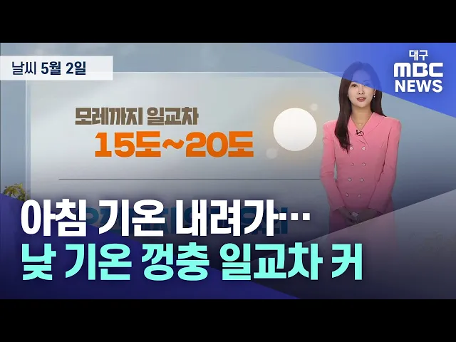 5월 2일 목요일 대구와 경북 지역은 대체로 맑은 가운데 일교차가 15~20도 안팎으로 크겠습니다.아침 최저 기온은 대구 6.6도, 안동 5.9도, 포항 8.5도 등을 보였습니다.낮 최고 기온은 대구와 안동 24도, 포항 20도 등 18도에서 26도로 전날보다 5~8도가량 높겠습니다.대구지방기상청은 오전까지 대구, 경북 내륙에 가시거...