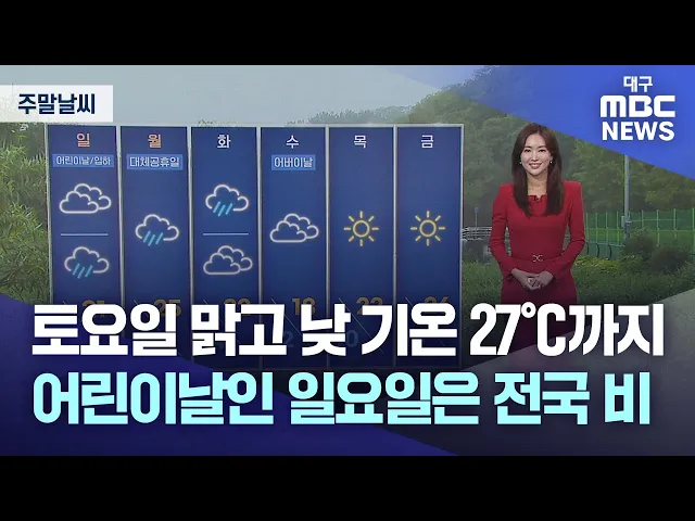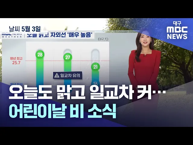 5월 3일 금요일도 일교차 큰 날씨가 이어졌죠. 토요일부터는 어린이날 연휴가 시작됩니다. 토요일 하늘 맑고 화창한 가운데 대구의 아침 기온 12도로 대부분 지역에서 평년 수준 보이겠고요. 낮 기온은 27도까지 껑충 올라 금요일만큼 덥겠습니다. 반면 어린이날이자 절기 ‘입하’인 일요일에는 전국에 비가 내리겠는데요. ...