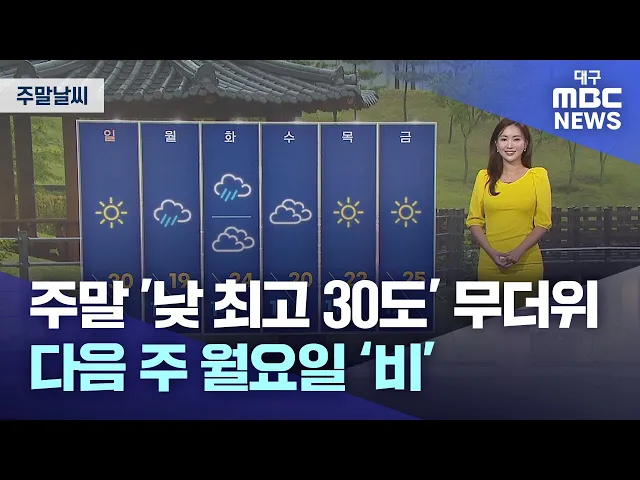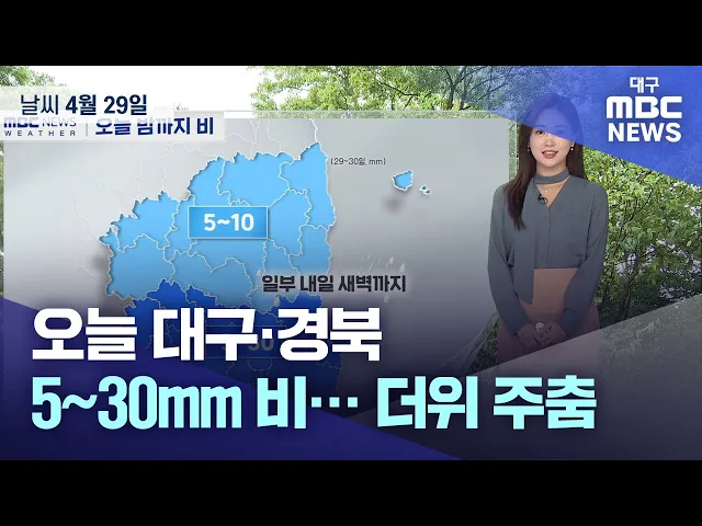 주말 동안 정말 더웠죠. 오늘은 때 이른 더위를 식혀줄 비 소식이 있습니다. 대구와 경북에는 오늘 오전부터 비가 내리기 시작해서요. 오늘 밤까지 대구와 경북에 5~30mm, 경북 북부와 울릉도, 독도에는 5~10mm의 비가 예상됩니다. 비는 오늘 밤 대부분 그치겠는데요. 경북 남부는 내일 이른 새벽까지 비가 이어지는 곳도 ...