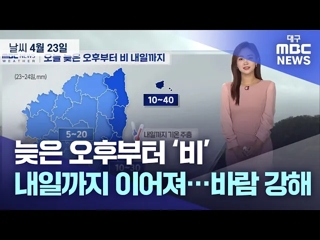 대구와 경북 지역은 4월 23일 화요일도 흐린 가운데 늦은 오후부터 비가 오는 곳이 있겠습니다.예상 강수량은 수요일까지 경북 동해안에 10~30mm, 그 밖의 내륙에 5~20mm입니다.대부분 지역에서 바람도 강하게 불겠습니다.화요일 아침 최저 기온은 대구 12.6도, 안동 7.9도, 포항 13.5도 등이었습니다.낮 최고 기온은 대구 ...