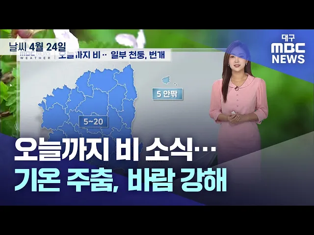 오늘도 우산을 챙겨 나가셔야겠습니다. 저기압의 영향으로 오늘까지 비가 내리겠는데요. 대구와 경북 남부에는 오늘 낮까지, 경북 북부는 저녁까지 비가 가끔 이어지겠고요. 예상되는 비의 양은 5~20mm입니다. 특히 오늘 오전부터 낮 사이 대기가 불안정해져 일부 지역에는 돌풍과 천둥, 번개를 동반한 강한 비가 오는 곳이...
