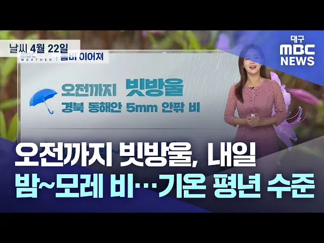 주말 동안 봄비가 내렸는데요.오늘도 경북동해안에는 오전까지 5mm 안팎의 비가 가끔 비가 오는 곳이 있겠습니다.대구와 경북에도 오전까지 빗방울이 떨어지는 곳이 있겠는데요.오늘은 비의 양이 적고 내렸다 그치기를 반복하며 소강상태를 보이는 곳이 많겠습니다.내일 밤부터 또 비 소식이 있습니다.우리 지역에는 내일 ...
