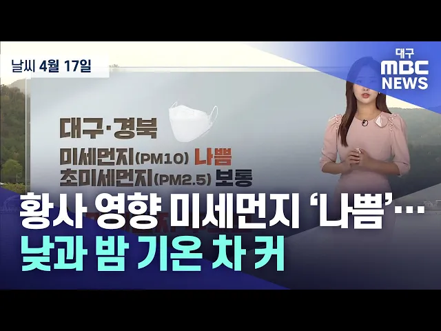 4월 17일 수요일 대구와 경북 지역은 대체로 맑은 가운데 황사의 영향으로 종일 공기가 탁했습니다.낮 최고 기온은 김천 25.9도, 대구 24.6도 등 18.8도에서 25.9도로 전날과 비슷하거나 조금 높았습니다.경북에는 황사 위기 경보 '주의' 단계가 내려져 있습니다.목요일은 대체로 맑겠지만 미세먼지와 초미세먼지는 '나쁨' ...