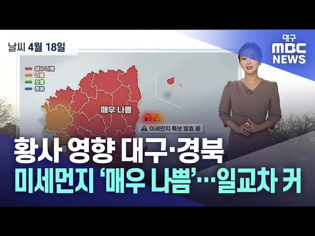 바람을 타고 날아온 불청객 황사에 전국의 공기가 무척 탁합니다.오늘도 대구와 경북은 황사에 뒤덮여 미세먼지 농도가 매우 높은데요.현재 우리 지역에는 ‘미세먼지 특보’가 계속 발효 중이고요.경북 서부 일부 지역을 제외한 대구와 경북 대부분 지역의 미세먼지 농도 종일 ‘매우 나쁨’ 수준 예상됩니다.특히 경북동해안...