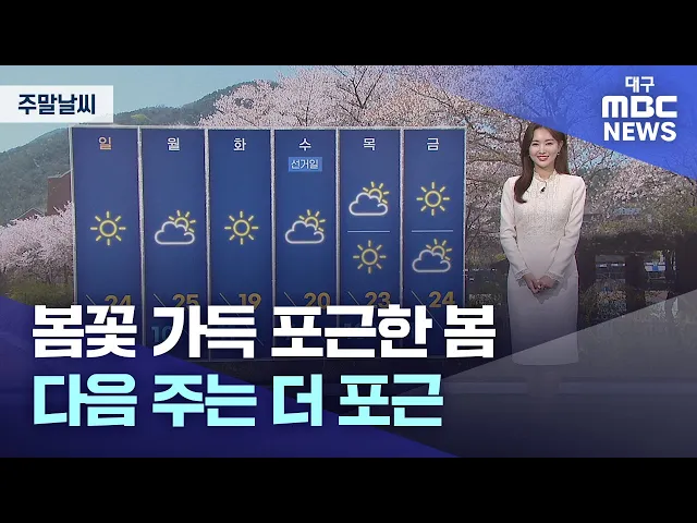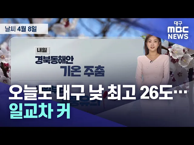 벚꽃잎이 흩날리는 포근한 주말이었습니다. 어제 대구와 경북은 낮 동안 기온이 껑충 올라 대부분 지역에서 25도 안팎을 기록했는데요. 오늘도 우리 지역의 낮 최고 기온 20~25도 예상돼 평년보다 4~6도가량 높겠습니다. 내일까지 아침 기온도 평년을 웃돌겠는데요. 다만 낮 기온이 급격히 올라 낮과 밤의 기온 차가 매우 ...