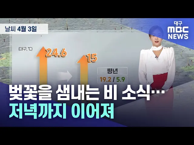 이제 막 벚꽃이 만개했는데 야속한 빗줄기가 꽃잎을 떨어트리고 있습니다. 현재 대구와 경북 대부분 지역에 비가 내리고 있는데요. 오늘까지 대구와 경북에는 5~30mm, 경북 남부 동해안에는 10~40mm의 비가 예상되고요. 특히 경북 남부 동해안을 중심으로 오늘 낮까지 시간당 10mm 안팎의 세찬 비가 오는 곳이 있겠습니다. ...