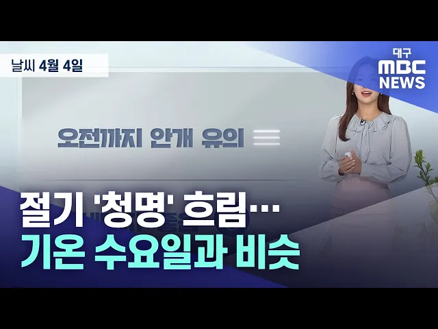 오늘은 하늘이 차츰 맑아진다는 뜻을 지닌 절기 '청명'입니다.다만 오늘 오전까지 경북내륙을 중심으로 가시거리 1km 미만의 안개가 끼어 있는 곳이 있겠고요.안개가 걷히고도 하늘은 대체로 흐리겠습니다.그래도 공기 질은 청정한데요.오늘 대구와 경북의 미세먼지 농도 ‘좋음’ 수준 예상됩니다.어제 우리 지역에는 꽤 많...