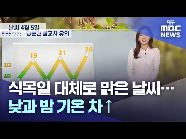 절기상 '청명'인 4월 4일 목요일 대구와 경북 지역은 대체로 흐리고 일교차가 큽니다.낮 최고 기온은 대구 15.7도, 안동 14.4도, 포항 13.8도 등이었습니다.금요일인 5일은 대체로 흐리다 오후부터 차차 맑겠습니다.금요일 아침 최저 기온은 3~10도, 낮 최고 기온은 13~20도로 1~3도가량 기온이 오르겠습니다.미세먼지와 초...