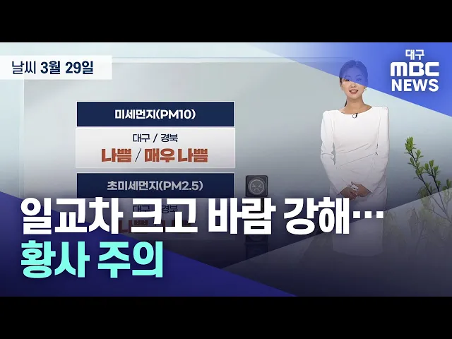 3월 29일 금요일 대구와 경북 지역은 구름 많고 포근한 가운데 한때 약한 비가 오는 곳이 있겠습니다.예상 강수량은 경북 북부와 남서 내륙에 1mm 안팎입니다.황사의 영향으로 미세먼지와 초미세먼지 농도는 종일 나쁨에서 매우 나쁨 수준을 보이겠습니다.경북 북동 산지와 울진, 영덕에는 강풍주의보가 내려졌고, 그 외 지...
