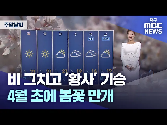 3월 28일 목요일 대구·경북은 종일 흐리고 비가 오겠습니다.예상 강수량은 경북 남부 동해안에 10~40mm, 그 밖의 대구와 경북 전역에 5~20mm입니다.동해안을 중심으로 강한 바람이 불겠고 내륙에는 내몽골고원 부근에서 발원한 황사가 유입돼 비와 섞여 내리는 곳이 있겠습니다.목요일 아침 최저 기온은 대구 9.1도, 포항 9...