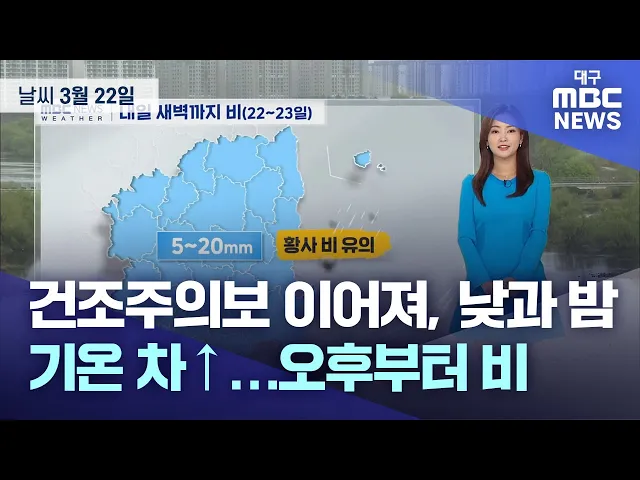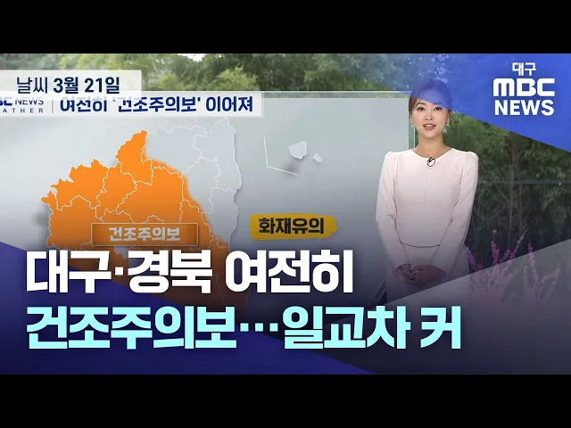 3월 21일 목요일 대구‧경북은 대체로 맑다가 차차 구름이 많아지겠습니다.아침 최저 기온은 대구 0.4도, 안동 영하 2.1도, 포항 1.6도 등으로 쌀쌀했습니다.낮 최고 기온은 대구 13도 등 8도에서 14도로 일교차가 15도 안팎으로 크겠습니다.군위를 제외한 대구와 경북 대부분 지역에 건조주의보가 발효 중입니다.대구지방기...