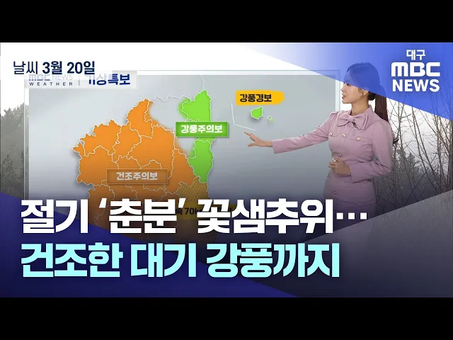 봄기운이 더욱 짙어지는 듯했는데 지난주보다 기온이 더 떨어졌습니다.봄의 네 번째 절기 '춘분'이 왔지만, 얄궂은 꽃샘추위가 문제입니다. 다음 주까지 계속해서 기온 변동이 크겠는데요. 북서쪽에서 찬 공기가 내려와 금요일까지 대구와 경북의 기온은 평년보다 낮겠고요. 경북내륙을 중심으로 아침 기온이 영하권 보이는...