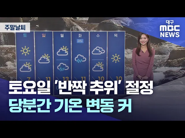 토요일인 오늘 대구와 경상북도는 낮은 기온에 바람까지 강하게 불어 다소 춥겠습니다.낮 기온은 3도에서 7도 사이로 평년 기온보다 5도가량 낮겠습니다. 일요일인 내일은 대체로 흐리다가 오후부터 맑아집니다. 아침은 영하 3도에서 2도, 낮에는 7도에서 12도로 오늘보다는 포근해집니다. 경북 북부와 울릉도 등에는 눈에 ...