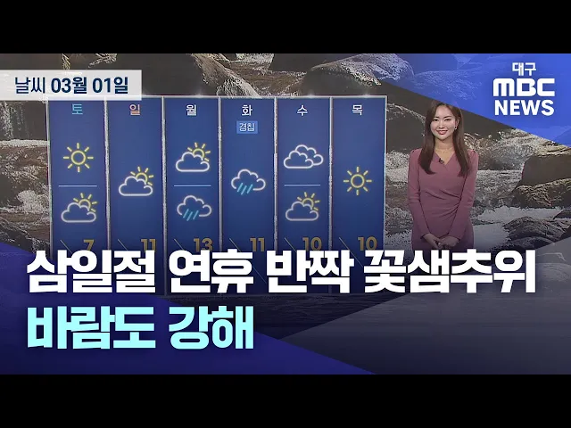 오늘은 3월의 첫날이자 105주년 삼일절입니다.북서쪽에서 찬 공기가 내려오며 삼일절 연휴와 함께 반짝 꽃샘추위가 찾아왔는데요.오늘 아침 대구의 기온 0.5도로 대부분 지역에서 어제보다 2~6도가량 낮게 출발합니다. 낮에도 3도에 그치며 평년보다 낮겠고요.특히 내일 아침 대구의 기온은 -6도까지 뚝 떨어져 매우 춥겠습...