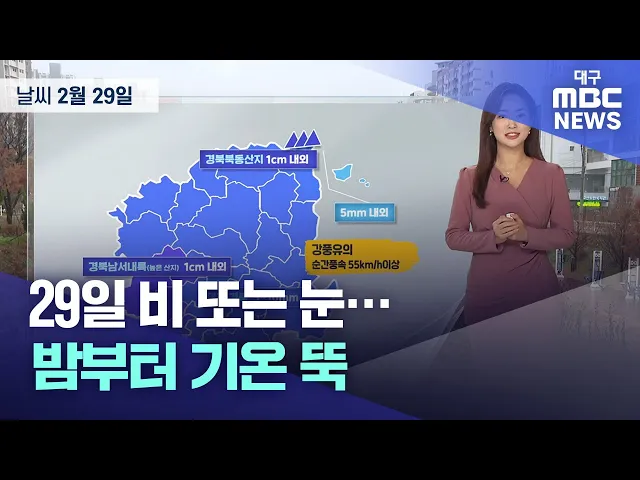 2월의 마지막 날은 우산을 챙겨 나가셔야겠습니다. 오늘 오전부터 밤사이 대구와 경북에는 가끔 비 또는 눈이 내리겠는데요. 예상되는 비의 양은 5~10mm로 많지는 않겠습니다. 다만 경북 북동 산지를 비롯해 경북 남서 내륙의 높은 산지에는 비가 눈으로 바뀌어 내리는 곳도 있겠고요. 오늘 오후부터 내일까지 대부분 지역...