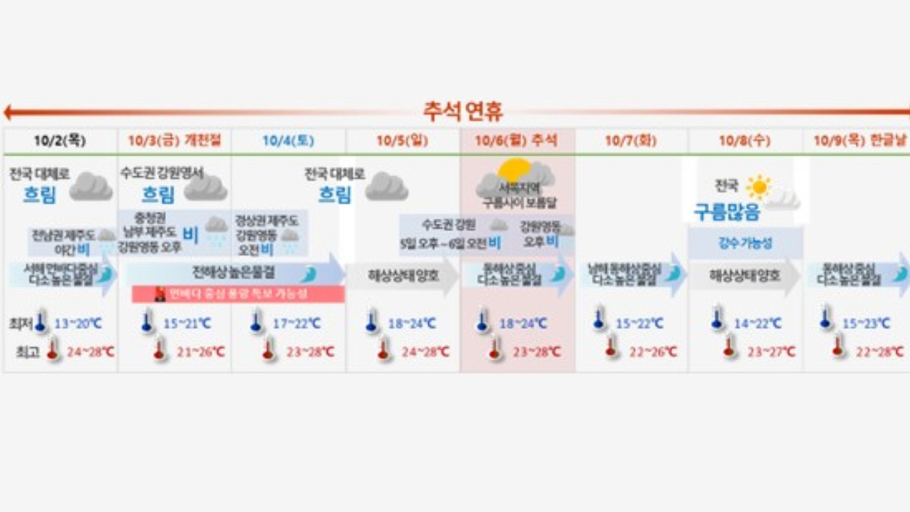 자료 출처 대구지방기상청추석 연휴 대구와 경북 지역은 평년보다 온화한 날씨가 이어지겠습니다.대구지방기상청은 연휴 기간 아침 최저 기온은 13도에서 21도, 낮 최고 기온은 22도에서 28도로 평년보다 높을 것으로 내다봤습니다. 연휴 첫날이자 개천절인 10월 3일 낮부터 저기압의 영향으로 비가 내리다 4일 새벽에 대부...