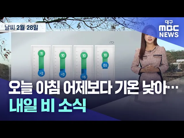 대구와 경북 지역은 구름 많은 가운데 일교차가 10도 이상 크겠습니다.2월 28일 수요일 아침 최저 기온은 대구 영하 2.4도, 안동 영하 4도, 포항 0.4도 등으로 쌀쌀했습니다.낮에는 대구 11도 등 9~12도까지 오르겠습니다.미세먼지와 초미세먼지 농도는 '좋음' 수준이 예보됐습니다. 목요일은 바람 불고 흐리겠고 오전부터 ...
