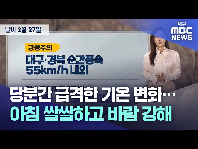 2월 27일 화요일 대구와 경북 지역은 구름 많고 일교차가 10도 이상 크겠습니다.아침 최저 기온은 대구 영하 1도, 안동 영하 3.6도, 포항 3.2도 등이었습니다.낮 최고 기온은 대구 9도 등 5~10도의 분포로 순간풍속 시속 55km 안팎의 강한 바람이 부는 곳이 많아 체감온도는 더 떨어지겠습니다.동해상에는 풍랑주의보가 발...