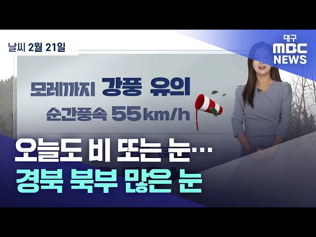 2월 21일 수요일 대구와 경북 지역은 종일 흐린 가운데 목요일까지 비나 눈이 오겠습니다.예상 강수량은 경북 동해안에 10~40mm, 내륙에는 5~30mm입니다.대설특보가 내려진 경북 북동 산지에는 목요일까지 10~40cm의 많은 눈이 내려 쌓이겠고 북부 동해안에는 5~15cm, 그 밖의 내륙은 1cm에서 최대 10cm의 적설량이 예보됐...